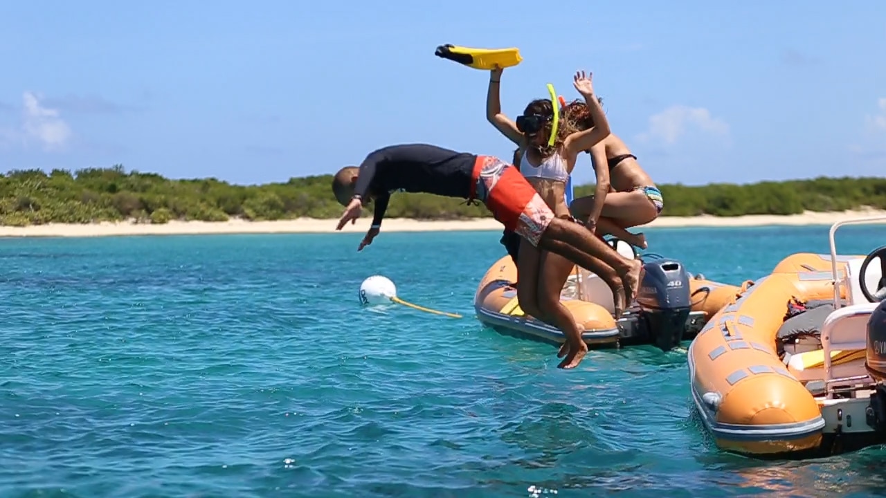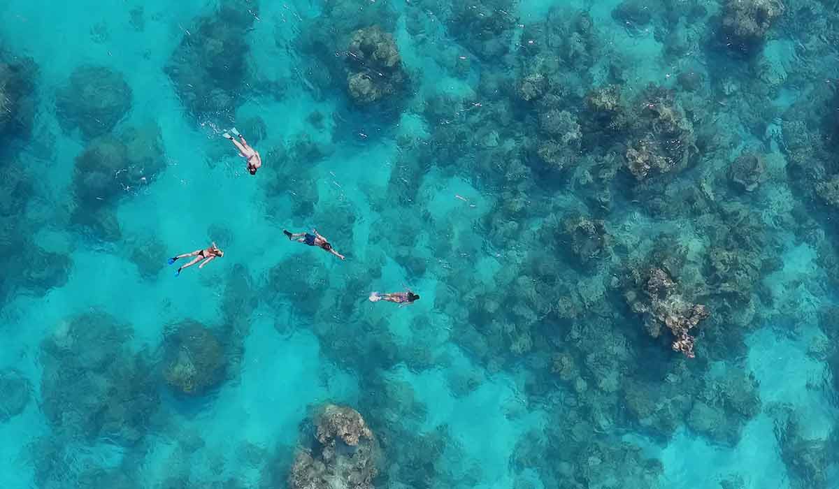 After an exhilarating 30-minute cruise, we arrived at our first destination. Your Guides will gather the Mini Boat convoy on a mooring close to the shallow reef, and jump in the water with you to explore the beautiful underwater grounds. Swim among different schools of tropical fish such as snappers, blue tangs, sergeant majors, parrotfish, and much more! Your guide will interpret the reef ecosystem for you and teach loads of cool and interesting facts. After the 45-minute snorkel, hop back on your Mini Boat, enjoy snacks and refreshments from your personal iced cooler, and take in all the amazing scenery.